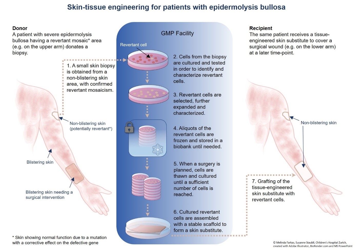 By developing an autologous tissue engineered skin (skingineering), assembled from keratinocytes and fibroblasts cultured from a biopsy of a patient’s revertant mosaic skin area, a lifetime therapeutic solution for EB patients could be created. The planned research is based on our expertise in basic, translational, and clinical research leading to an efficient transition from bench to bedside.